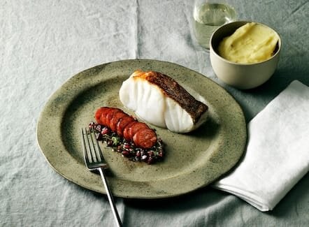 - Fry the garlic, shallot, tomatoes and chorizo in a frying pan with olive oil. Add the paprika, choricero pepper, salt, wine and lemon. To plate, create a base with the puree, place the skrei on top and decorate with the chorizo.