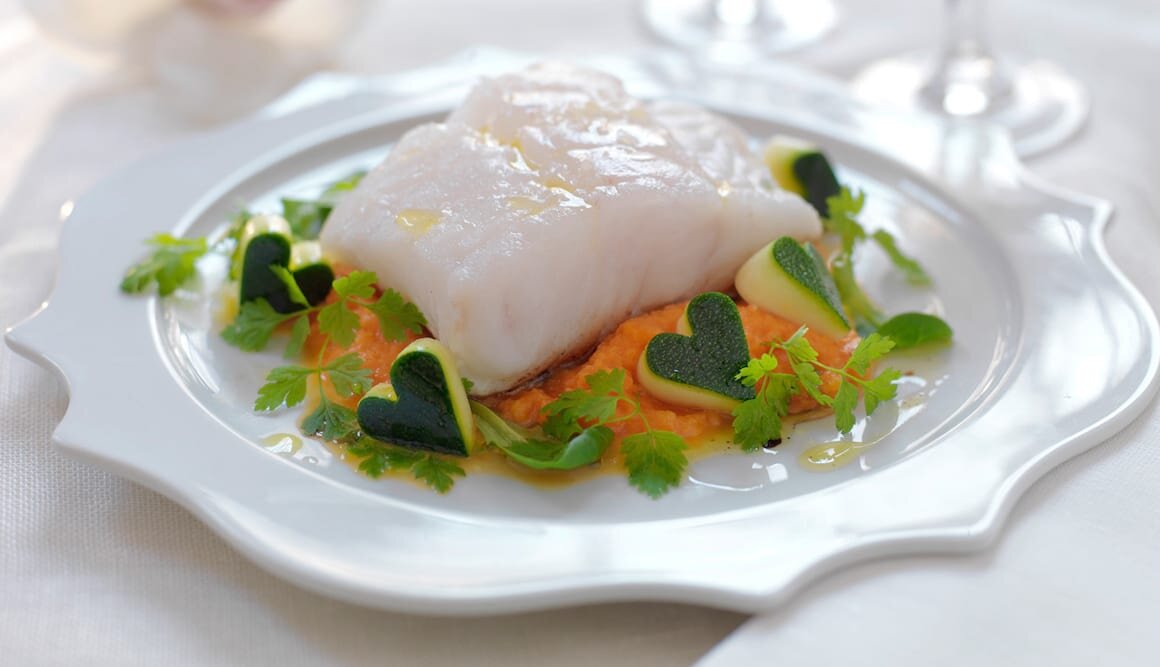 Serve the Skrei with carrot purée, gravy and steamed zucchini hearts.
